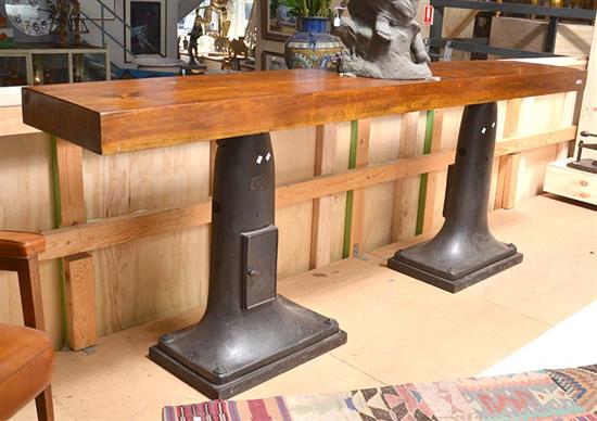CONSOLE CONSTRUCTED FROM SUGI WOOD BAR COUNTER FROM NORTHERN JAPAN AND 2 METAL ZEISS MOVIE CAMERA BASES, 99 HEIGHT X 274 WIDTH X 44CM DEPTH