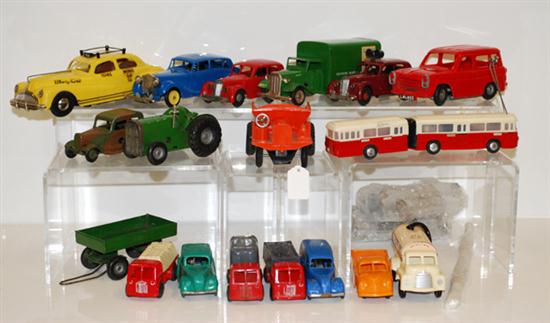 COLLECTION OF TRIANG MINIC PLASTIC AND TINPLATE VEHICLES, 2 X POSSIBLE REPAINTS, ALL UNBOXED, AND EHEIM PLASTIC TRAM WITH RAILS (G-E) (A LOT)