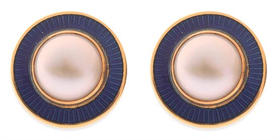 Each half pearl set within a border of blue enamel, to post and butterfly fittings, in 18ct gold, hallmarked D&F.
