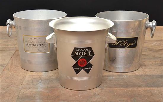 THREE METAL CHAMPAGNE BUCKETS 'MOET', 'POL ROGER' AND 'LAURENT PERRIER', ALL 20CM HIGH