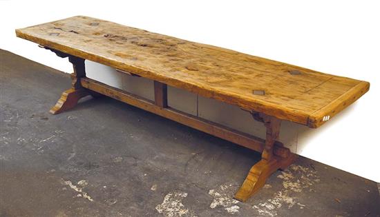 LARGE OAK REFECTORY TABLE ON STRETCHER BASE WITH ROUGH HEWN TOP, 72 HEIGHT X 302 LENGTH X 74CM DEPTH