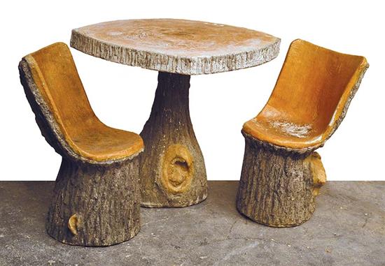 FRENCH BETON GARDEN SETTING COMPRISING A TABLE AND TWO CHAIRS IN THE FORM OF CARVED OAK, CIRCA EARLY 20TH CENTURY