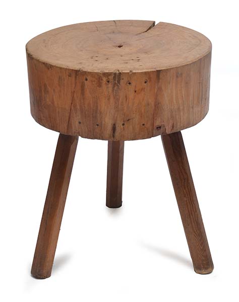 VINTAGE FRENCH CHOPPING BLOCK CONSTRUCTED FROM A SECTION OF SYCAMORE TREE WITH TRIPOD BASE, 47CM DIAMETER