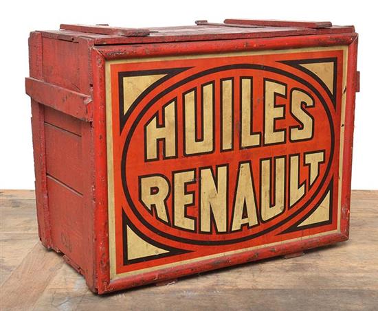 VINTAGE DECORATIVE FRENCH WOODEN OIL CRATE 'HUILES RENAULT', 50CM HEIGHT X 63CM WIDTH X 39CM DEPTH