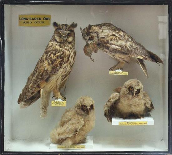 DIORAMA OF FOUR TAXIDERMIED OWLS, IN GLASS FRONTED WOODEN DISPLAY CASE, 56CM HEIGHT X 60CM WIDTH X 17CM DEPTH