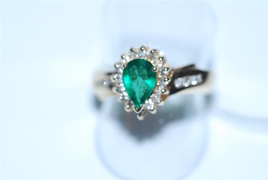 A PEAR CUT EMERALD AND DIAMOND RING IN 14CT GOLD