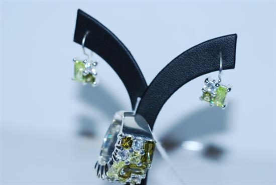 A PERIDOT AND CUBIC ZIRCONIA DRESS RING AND EARRINGS IN STERLING SILVER