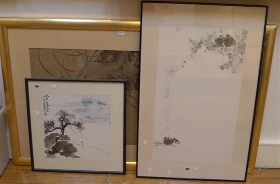 THREE ORIENTAL WORKS INCLUDING LARGE CHINESE WATERCOLOUR OF LANDSCAPE WITH BIRDS