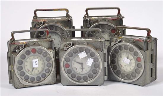 FIVE BELGIAN 'NATURAL ANTWERP JUNIOR' METAL CASED RACING PIGEON CLOCKS, CIRCA 1950S, ALL 17 HEIGHT X 16 WIDTH X 8.5CM DEPTH