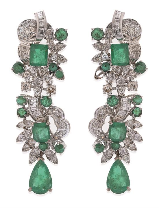 Each earring comprising emeralds and diamonds of varying cuts, in two articulated vertical clusters, suspending a pear cut emerald, to post and clip fittings in 14ct white gold.