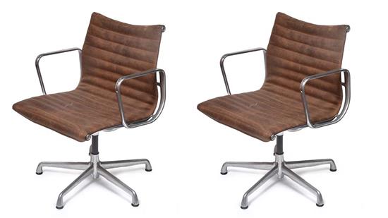 TWO EAMES ALUMINIUM SERIES OFFICE CHAIRS COVERED WITH BROWN LEATHER