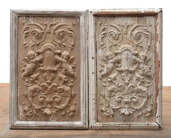 PAIR OF 19TH CENTURY MOULDED WOOD COACH PANELS, HIGH RELIEF CRESTS WITH PUTTI, 33 HEIGHT X 20CM WIDTH