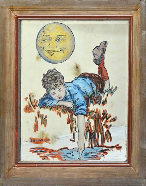 A LARGE TIMBER FRAMED MIRROR PAINTED WITH AN ILLUSTRATION OF A BOY UNDER THE MOON