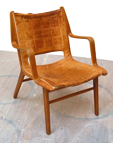DANISH AX CHAIR BY PETER HVILD AND OLA MOLGAARD-NIELSEN FOR FRITZ HANSEN WITH HEAVILY WORN LEATHER UPHOLSTERED SEAT, CIRCA 1947