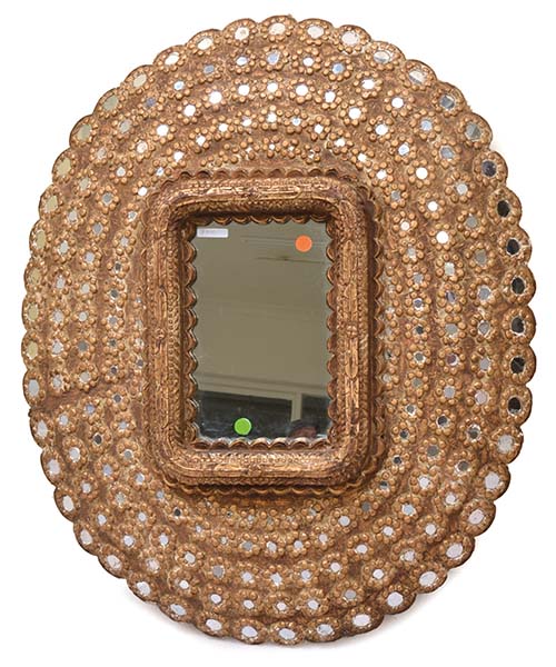 INDIAN GILT WOOD OVAL WALL MIRROR, 100CM HEIGHT X 83CM WIDTH