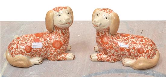PAIR OF PORCELAIN SPANIELS WITH IRON RED DECORATION, 36CM LENGTH EACH
