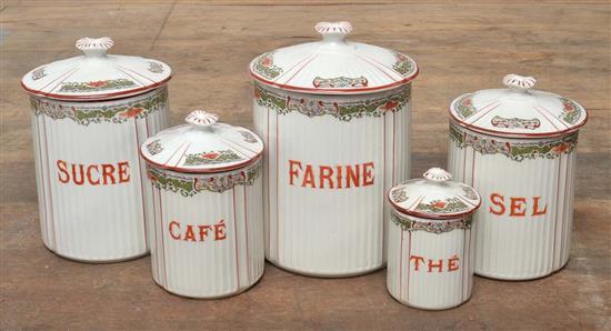 COLLECTION OF FIVE FRENCH CERAMIC STORAGE JARS, LARGEST 17CM HIGH