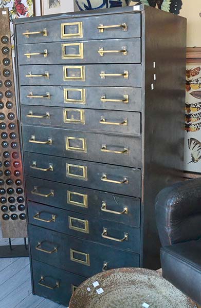 FRENCH INDUSTRIAL METAL FILING CABINET INCLUDING ELEVEN GRADUATED DRAWERS WITH BRASS HANDLES AND LABEL DISPLAYS, 157 HEIGHT X 70CM WIDTH X 64CM DEPTH