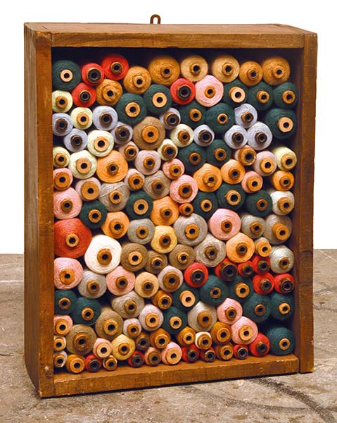 COLLECTION OF SPINDLES OF COLOURED YARNS IN WOODEN CRATE, 61 HEIGHT X 49 WIDTH X 19CM DEPTH