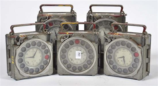 FIVE BELGIAN 'NATURAL ANTWERP JUNIOR' METAL CASED RACING PIGEON CLOCKS, CIRCA 1950S, ALL 17 HEIGHT X 16CM WIDTH X 8.5CM DEPTH