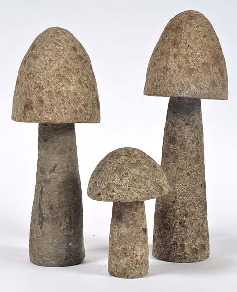 THREE FRENCH BASALT STONE DECORATIVE MUSHROOMS, CIRCA 1950S, LARGEST 41CM HIGH