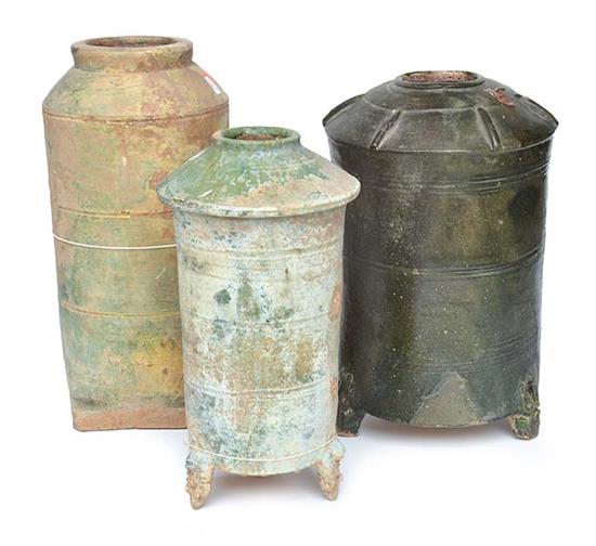 GROUP OF THREE HAN DYNASTY GRANARY JARS, LARGEST 41CM HIGH