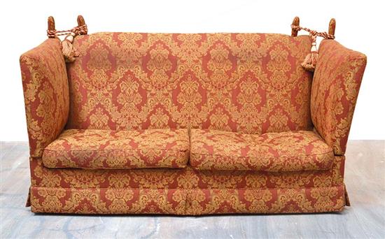 KNOLE SETTEE UPHOLSTERED IN RED AND GOLD BROCADE, 91CM BACK LENGTH