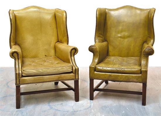 PAIR OF WINGBACKED ARMCHAIRS UPHOLSTERED IN OLIVE GREEN LEATHER
