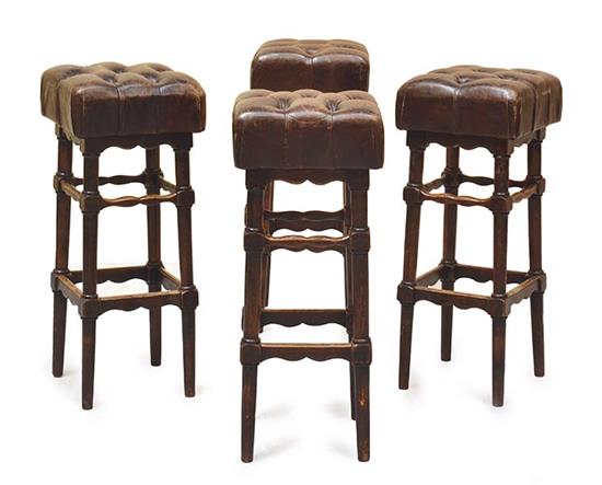 FOUR WELSH BAR STOOLS WITH BUTTONED BROWN LEATHER SEATS