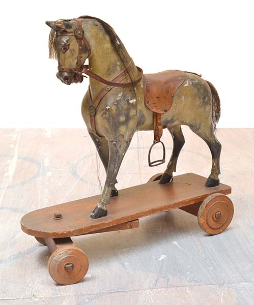 SMALL ANTIQUE CHILD'S DAPPLE GREY ROCKING HORSE ON CASTORS, 62CM LENGTH
