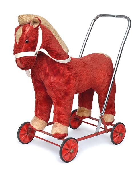 RETRO AUSTRALIAN JOYTOY CHILD'S PUSH ALONG PLUSH COVERED HORSE TOY ON CASTORS, CIRCA 1960S, 55CM LENGTH