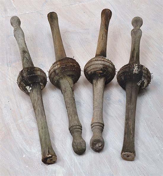 COLLECTION OF SIX WEATHERED CHINESE TIMBER HANDLES STUDDED WITH NAILS, THE LARGEST 102CM LENGTH