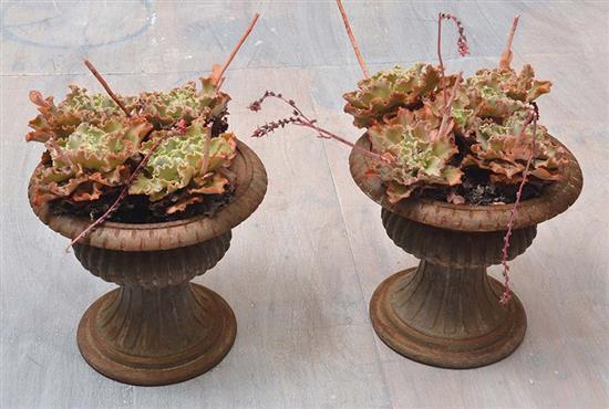 PAIR OF SMALL COMPOSITE TAZZA URNS PLANTED WITH SUCCULENTS, 42CM HEIGHT (TAZZA)