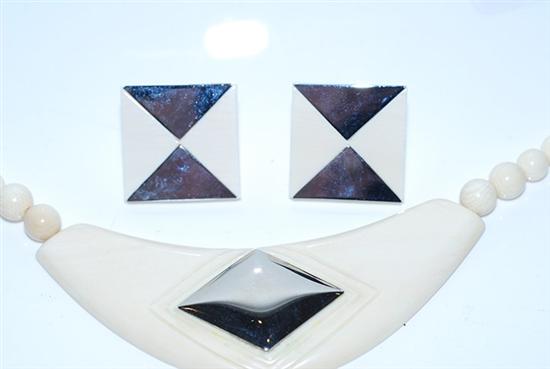 AN IVORY NECKLACE AND EARRINGS WITH SILVER DETAIL