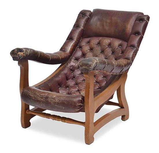STUDDED LEATHER UPHOLSTERED ARMCHAIR, HEAVILY WORN