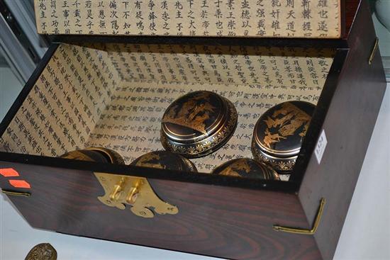 BRASS MOUNTED DOCUMENT BOX CONTAINING PORCELAIN LIDDED JARS