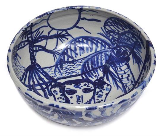 BLUE AND WHITE GLAZED BOWL, SIGNED, 33CM DIAMETER