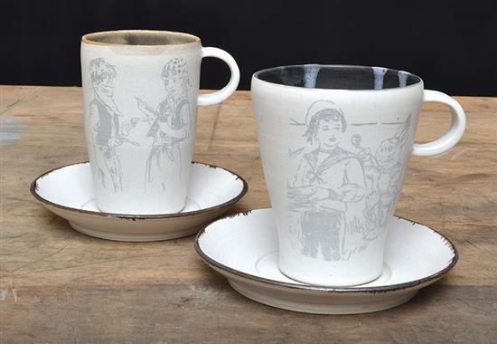 TWO STONEWARE MUGS DECORATED BY DAVID BROMLEY, SIGNED TO BASE, THE LARGEST MUG 14CM HIGH
