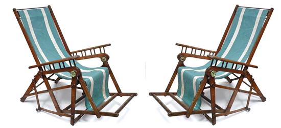 TWO EDWARDIAN ADJUSTABLE SUN CHAIRS WITH STRIPED TICKING SEATS