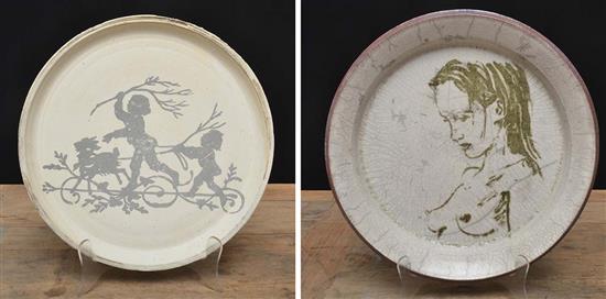 TWO STONEWARE PLATTERS DECORATED WITH DAVID BROMLEY IMAGES, SIGNED TO BASE, THE LARGEST 35CM DIAMETER