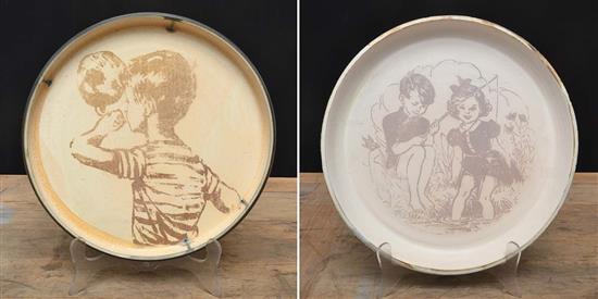 TWO STONEWARE PLATTERS DECORATED WITH DAVID BROMLEY IMAGES, SIGNED TO BASE, THE LARGEST 35CM DIAMETER