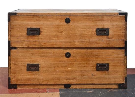 JAPANESE TWO DRAWER TRAVELLING CHEST WITH IRON BRACKETS, 57 X 90 X 44CM