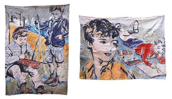 TWO QUILTS WITH PRINTED DAVID BROMLEY ARTWORK, 120 HEIGHT X 68CM WIDTH