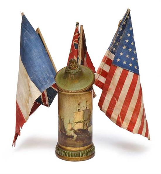 GROUP OF SIX HAND HELD FLAGS INCLUDING UNION JACK AND AUSTRALIAN, IN PAINTED WOODEN CONTAINER, CIRCA EARLY 20TH CENTURY