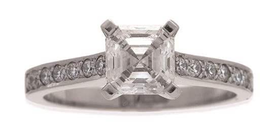 Centrally set with an asscher cut diamond weighing 1.01cts, within diamond set shoulders, in 18ct white gold, ring size L-M.