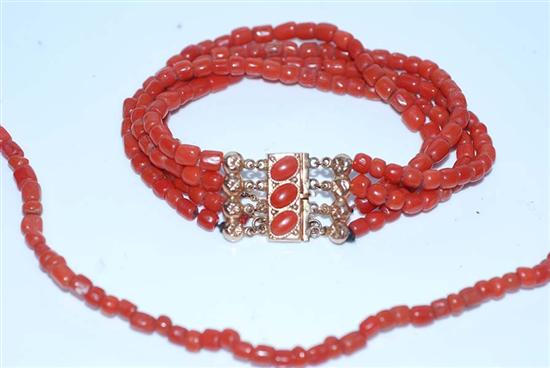 A CORAL NECKLACE AND MULTI STRAND CORAL BRACELET TO A 14CT GOLD CORAL SET CLASP