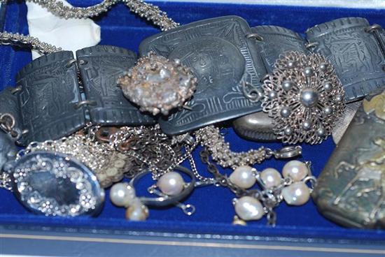 A COLLECTION OF SILVER JEWELLERY INCLUDING MEXICAN SILVER BRACELET, MESH NECKLACE, CULTURED PEARL BRACELET, PENDANTS, VESTA ETC.