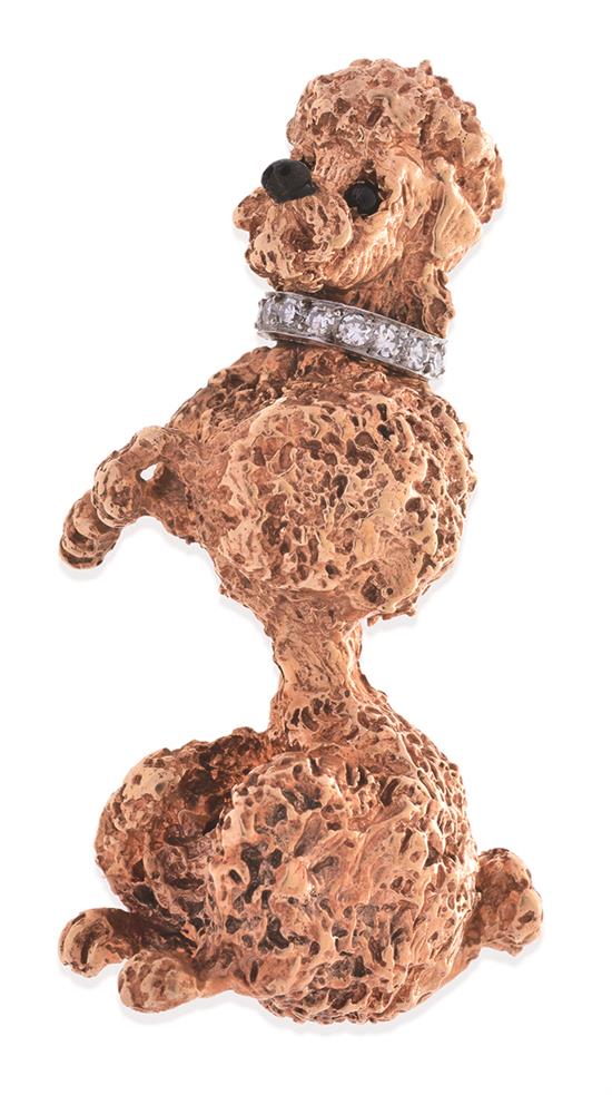 The finely crafted poodle, with a diamond set collar, in textured finish, in 14ct gold.