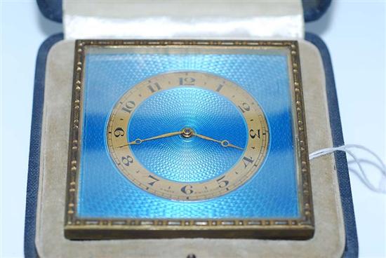A TRAVEL/DESK CLOCK WITH A BLUE GUILLOCHE ENAMEL FACE BY DRUMMONDS, IN ORIGINAL BOX.