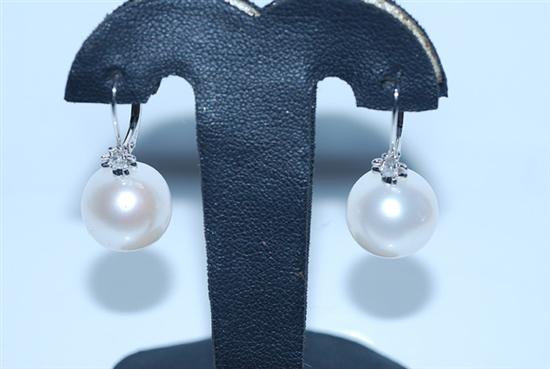 A PAIR OF PEARL AND DIAMOND EARRINGS TO SHEPHERD HOOK FITTINGS IN 18CT WHITE GOLD